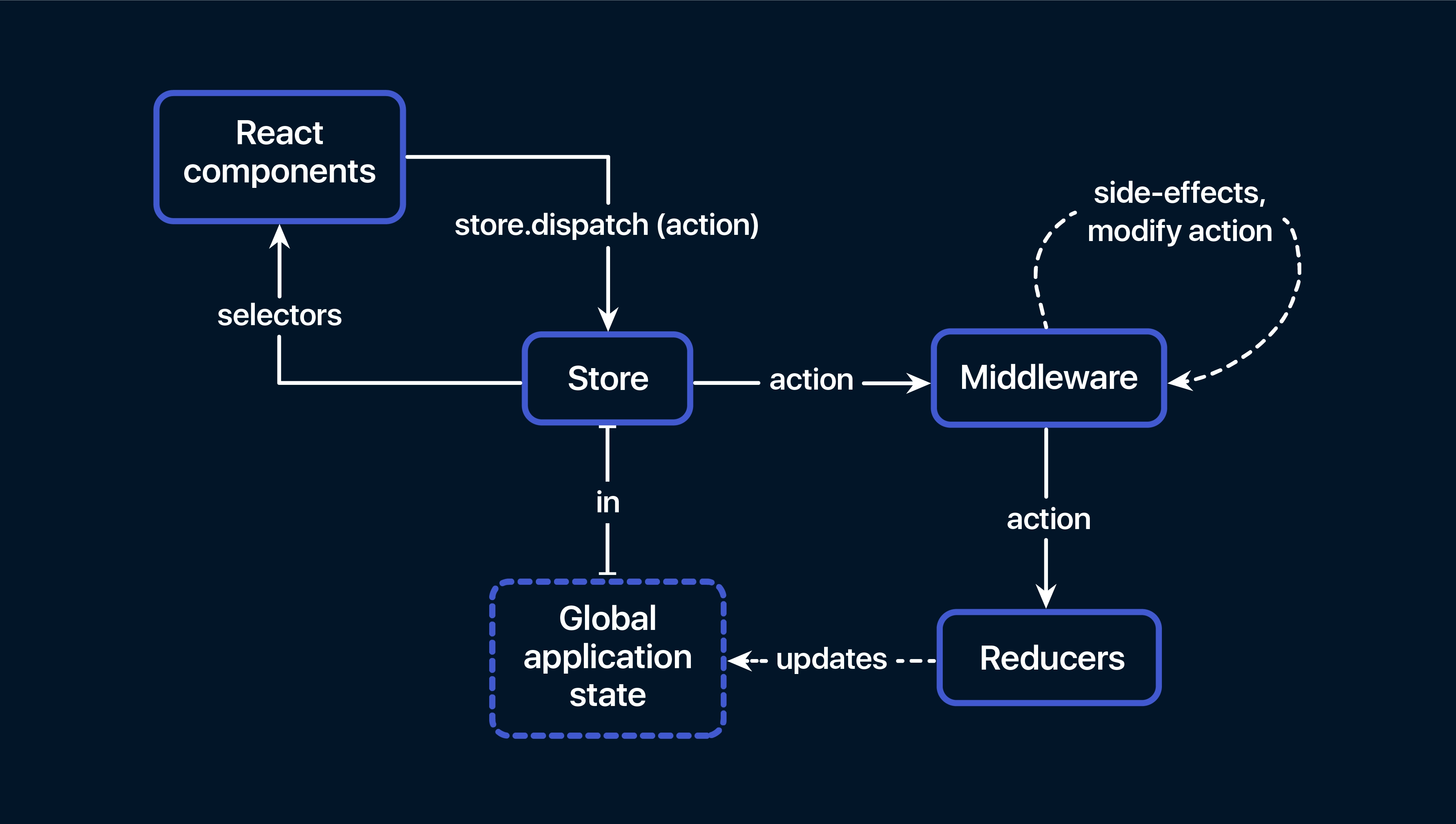 You then dispatch an action which get's passed to your middleware for processing and handling side effects before reaching your reducers.